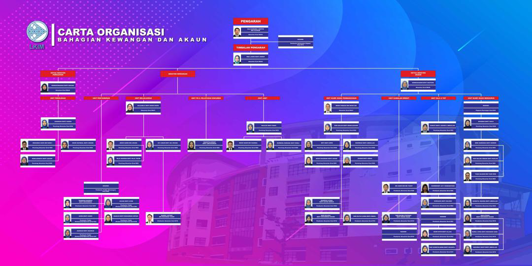 Pengurusan Bahagian Kewangan dan Akaun terbahagi kepada dua (3) Seksyen iaitu Seksyen Pengurusan Akaun, Seksyen Pengurusan Kewangan dan Seksyen Pengurusan Belanjawan. Seksyen-seksyen dipecahkan mengikut unit-unit tertentu berdasarkan peranan dan tugas yang dilaksanakan.